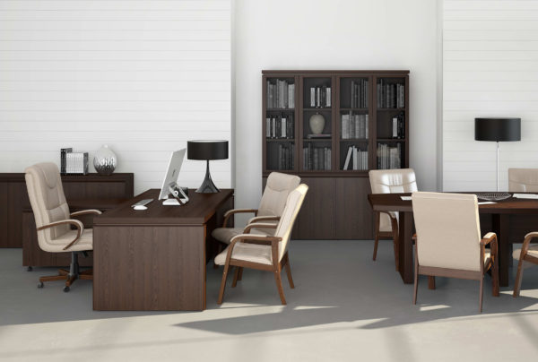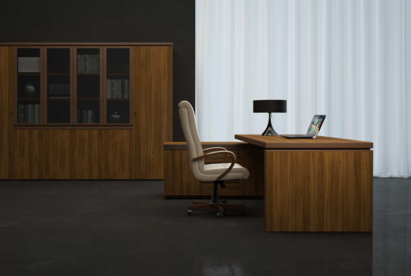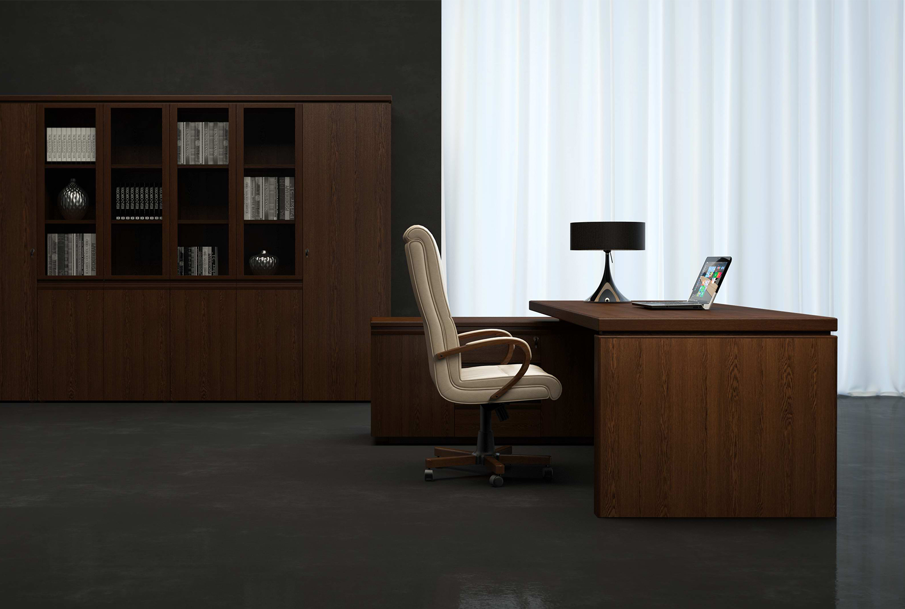 Все фасадные элементы изделий обложены массивом твердолиственных пород древесины толщиной 10 мм, придающим кабинету более дорогой статусный внешний вид. Все рабочие горизонтальные поверхности столов, приставных элементов, брифинг-приставок, подверженные повышенному износу, облицовываются высококачественным пластиком HPL в цвет ЛДСтП, повышающим прочностные характеристики лицевого покрытия. Выверенную геометрию подчеркивают ручки, выполненные из массива древесины, используемые на всех видах шкафов и тумб кабинета. Стеклянные двери также исполнены в рамке из массива древесины, а с торцевой стороны рамки предусмотрена ручка, расположенная вдоль всей ширины дверцы, выполненная также из массива.
