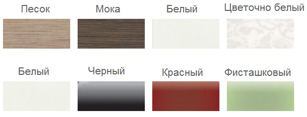 Доступны в двух вариантах: А) Деревянные: изготовленные из МДФ панелей толщиной 30 мм, покрыты полимерным листом (ПВХ), с закругленными углами и фигурной обработкой по периметру. Доступны в цветах: бьянко матрикс,мока, песок. В) Стеклянные, толщиной 12 мм, лакированные с обратной стороны поверхности, с закругленными углами и отшлифованными краями, доступны в цветах: черный, красный, фисташковый.