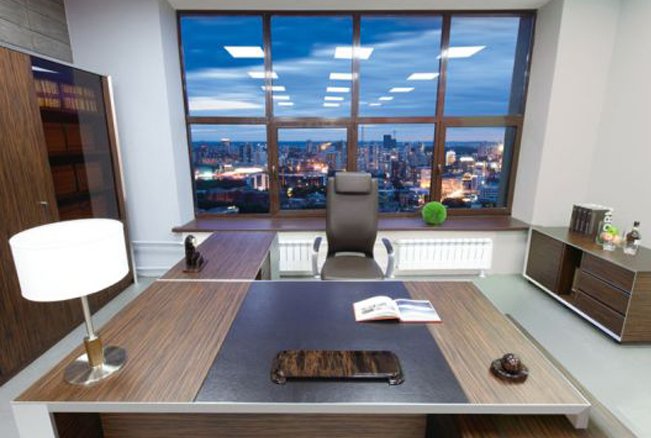• Бювары столешниц рабочих столов, дно выдвижных ящиков из мягкой экокожи темно-коричневого цвета