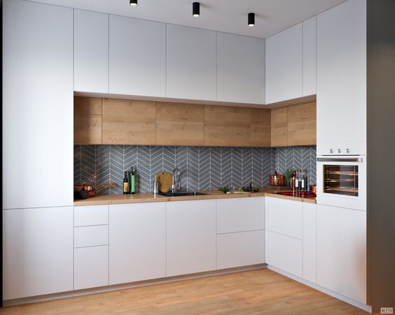 Кухня выполнена в комбинации светлых фасадов и имитацией дерева ( в данном случает ДСП EGGER).