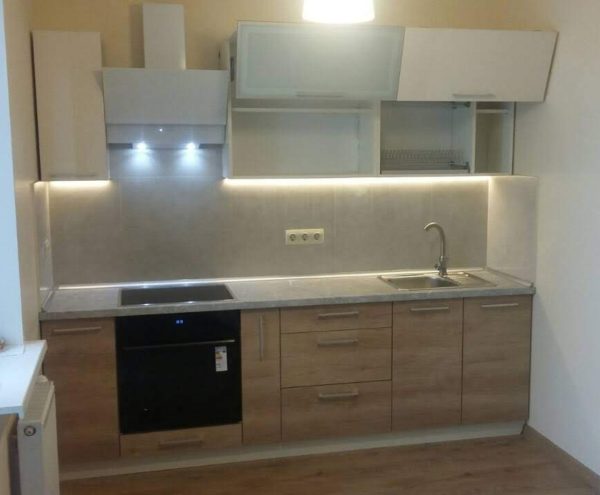 Стильная и лаконичная кухня. Сочетание белого глянца и текстурного ДСП – очень эффектный прием в дизайне.