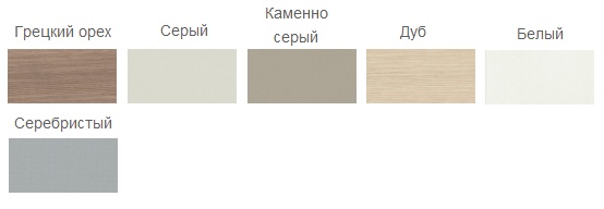 Столешницы изготовлены из ДСП толщиной 25 мм, покрыты меламином и окантованы по краям ABS кромкой толщиной 2 мм; доступны в следующих цветах: грецкий орех, серый, венге, клен, белый. Боковины изготовлены из ДСП толщиной 25 мм, покрыты меламином и окантованы по краям ABS кромкой толщиной 2 мм; доступны в следующих цветах: серебристый, грецкий орех, белый. Задние панели изготовлены из ДСП толщиной 18 мм, покрыты меламином и окантованы по краям ABS кромкой толщиной 0.4 мм под стать основному цвету; доступны в следующих цветах: серебристый, грецкий орех, серый, венге, клен, белый.